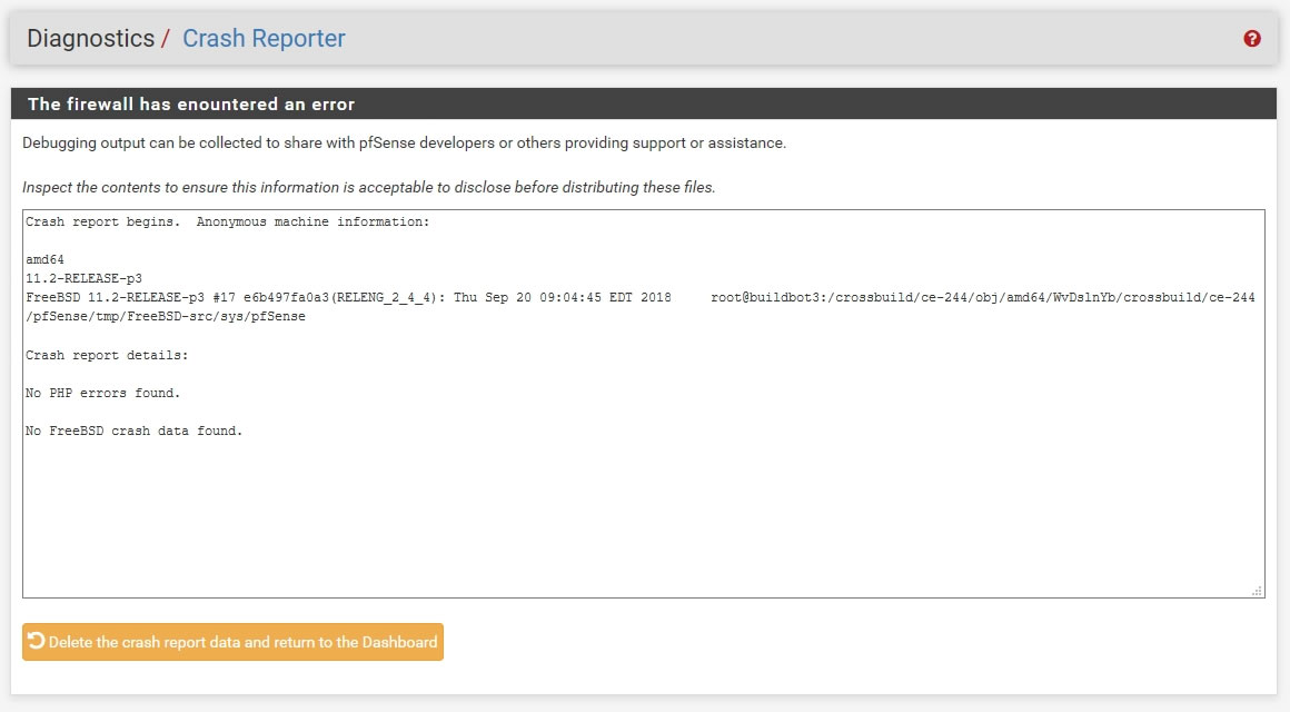 「pfSense has detected a crash report or programming bug. Click here for more information.」